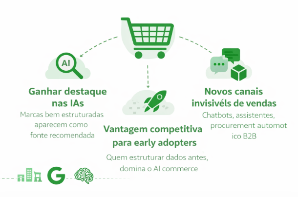 Nesse cenário, empresas que adotarem essas práticas desde cedo terão uma vantagem competitiva significativa, posicionando-se como líderes no ecossistema de AI Commerce.