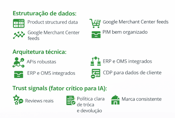 Organizar dados, estruturar feeds, integrar sistemas e fortalecer trust signals.